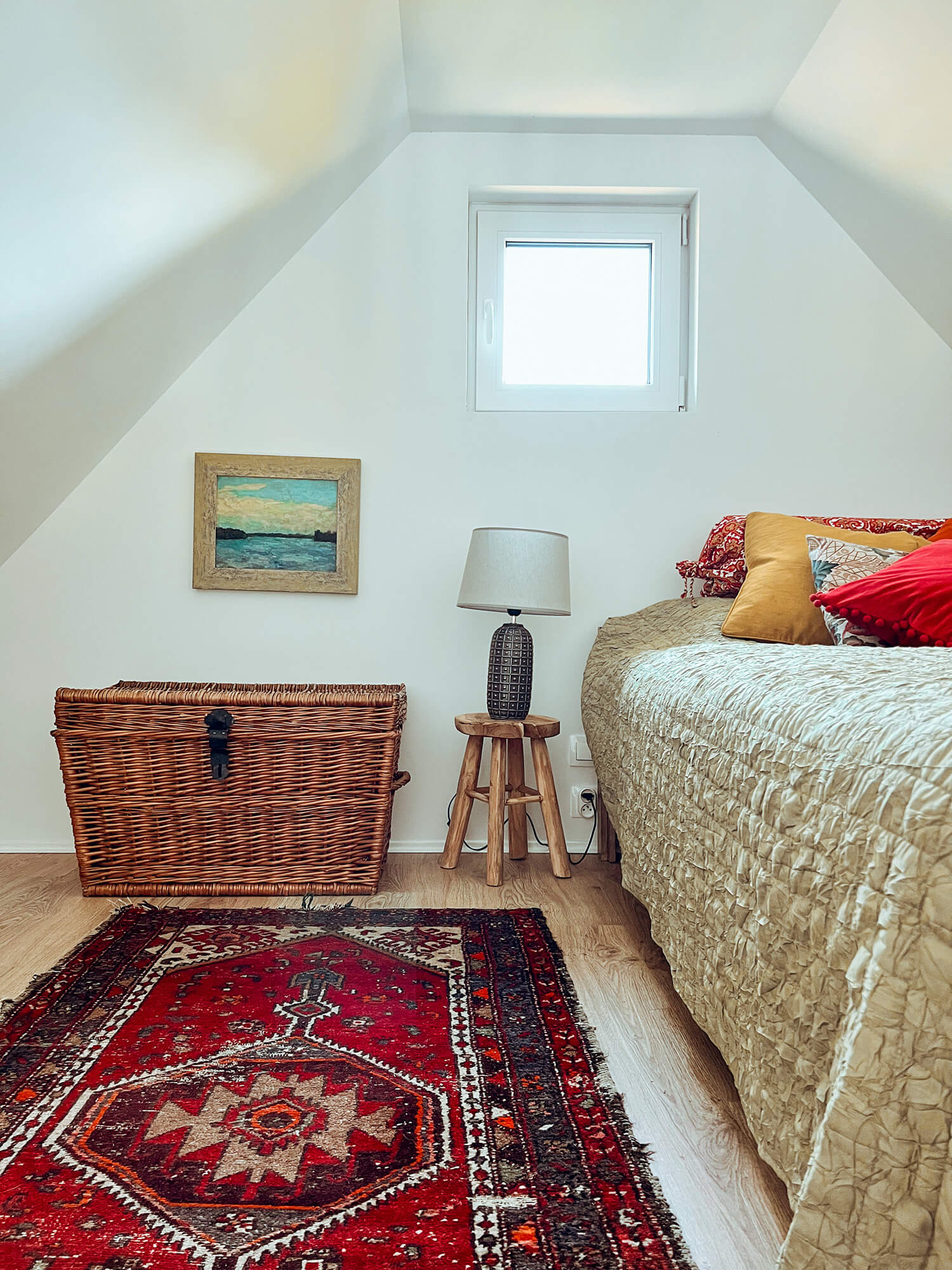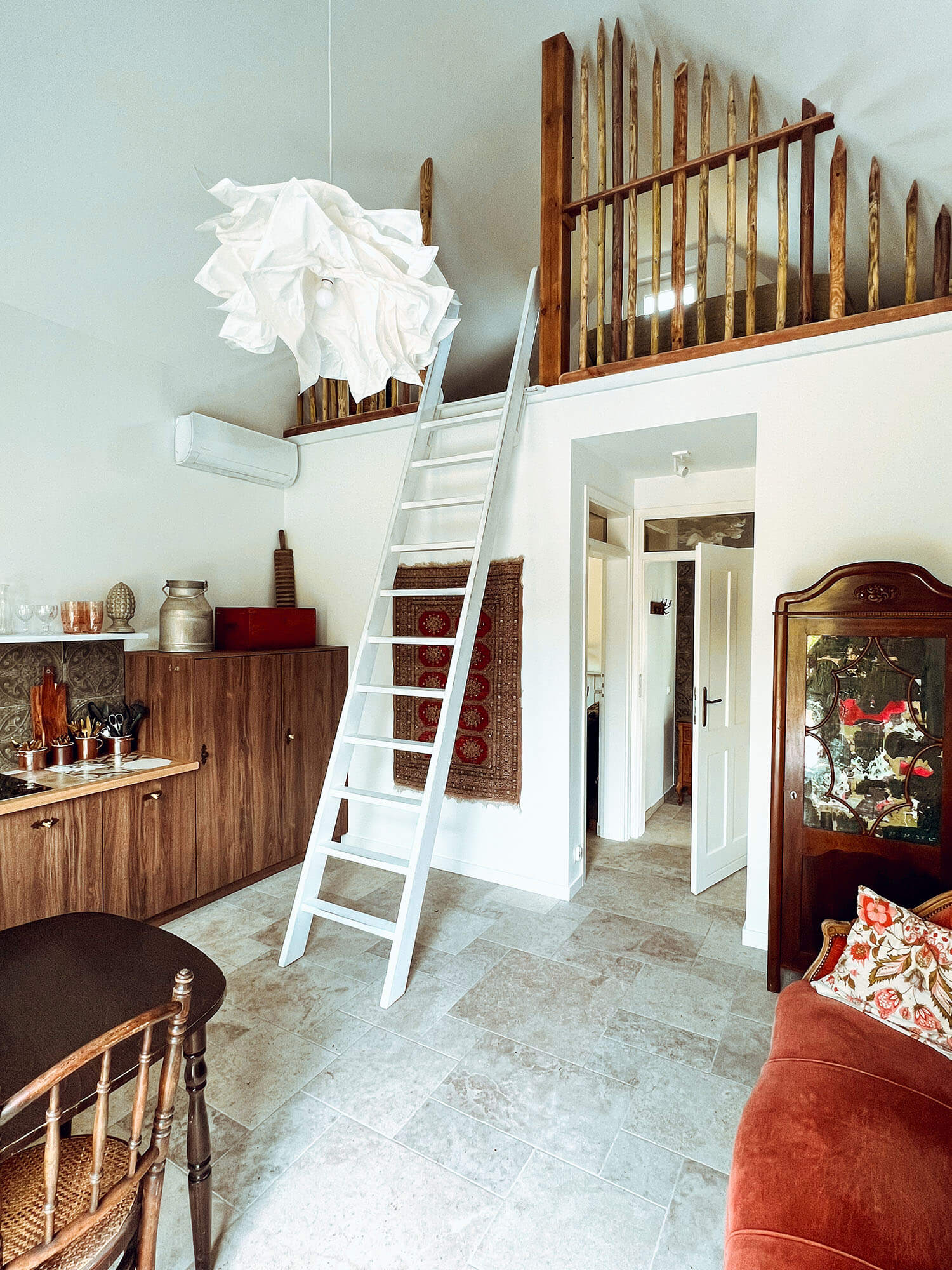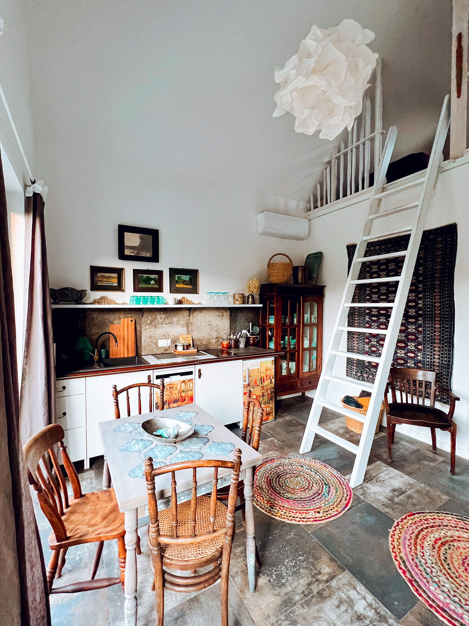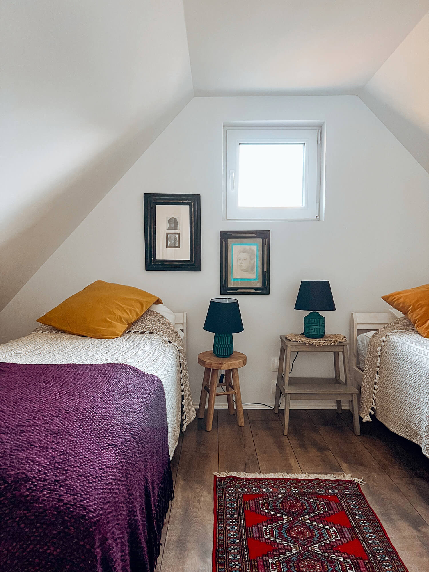 Domki są dwa – Refleksja i Inspiracja, a każdy z nich ma swój unikalny charakter i wystrój, który współgra z klimatem Pracowni Cieńsza. Tutaj też znajdziecie meble z historią, dekoracje z pchlego targu i wplecione w kompozycję dzieła Henryka Musiałowicza. Każdy z nich pomieści do 4 osób, ale idealnie sprawdzi się także dla pary, a nawet jednej osoby. W każdym domku znajduje się sypialnia i antresola z łóżkiem lub łóżkami, pokój dzienny z w pełni wyposażonym aneksem kuchennym oraz łazienka. W sypialni i salonie znajdują się duże okna, wychodzące na wszechobecną zieleń. Przedłużeniem domków jest taras, z którego rozciąga się widok na pola, łąki i las.