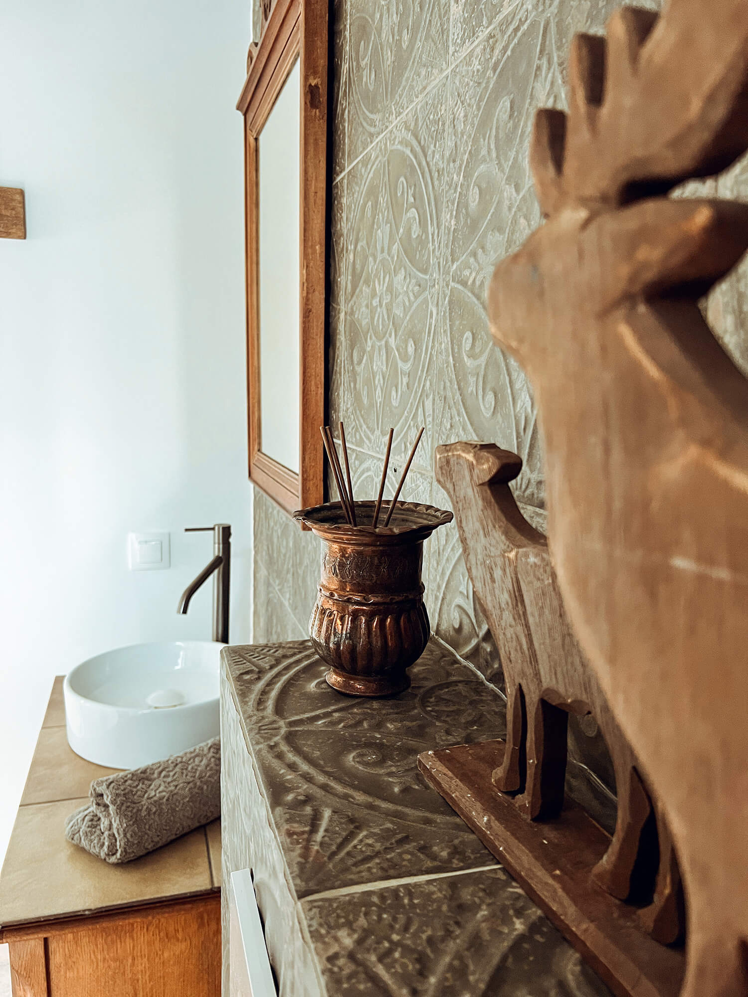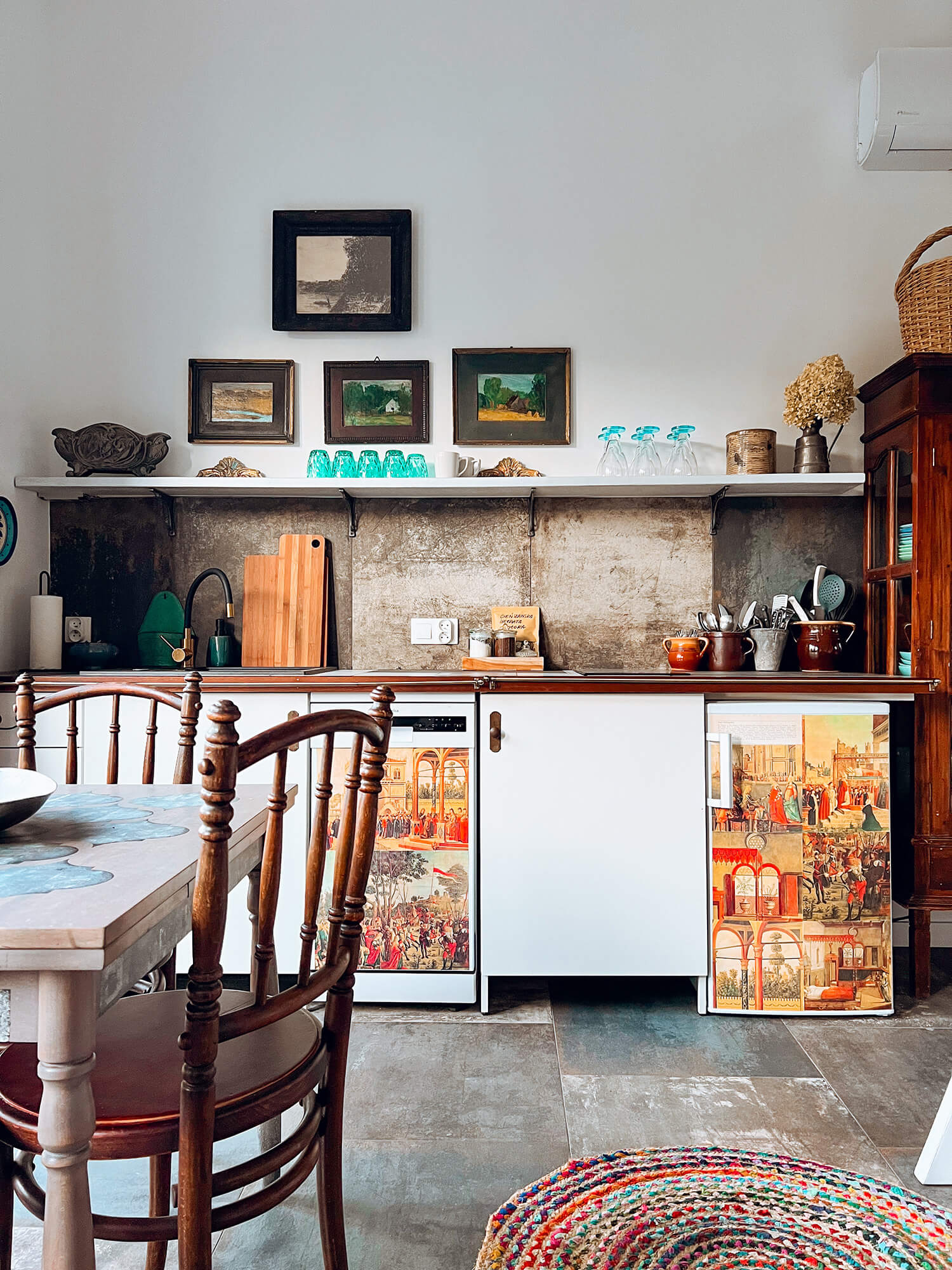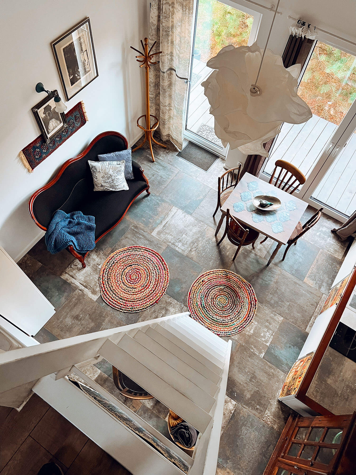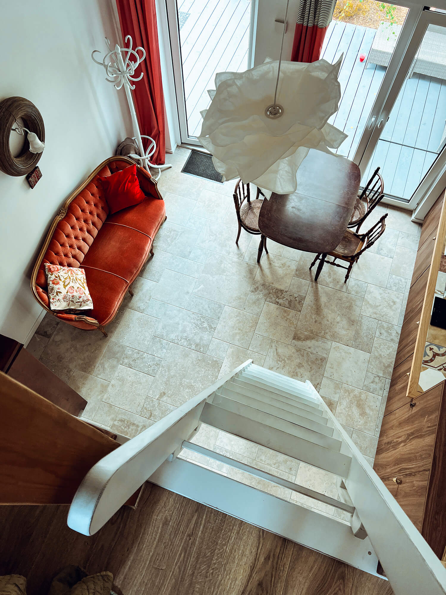 Domki są dwa – Refleksja i Inspiracja, a każdy z nich ma swój unikalny charakter i wystrój, który współgra z klimatem Pracowni Cieńsza. Tutaj też znajdziecie meble z historią, dekoracje z pchlego targu i wplecione w kompozycję dzieła Henryka Musiałowicza. Każdy z nich pomieści do 4 osób, ale idealnie sprawdzi się także dla pary, a nawet jednej osoby. W każdym domku znajduje się sypialnia i antresola z łóżkiem lub łóżkami, pokój dzienny z w pełni wyposażonym aneksem kuchennym oraz łazienka. W sypialni i salonie znajdują się duże okna, wychodzące na wszechobecną zieleń. Przedłużeniem domków jest taras, z którego rozciąga się widok na pola, łąki i las.